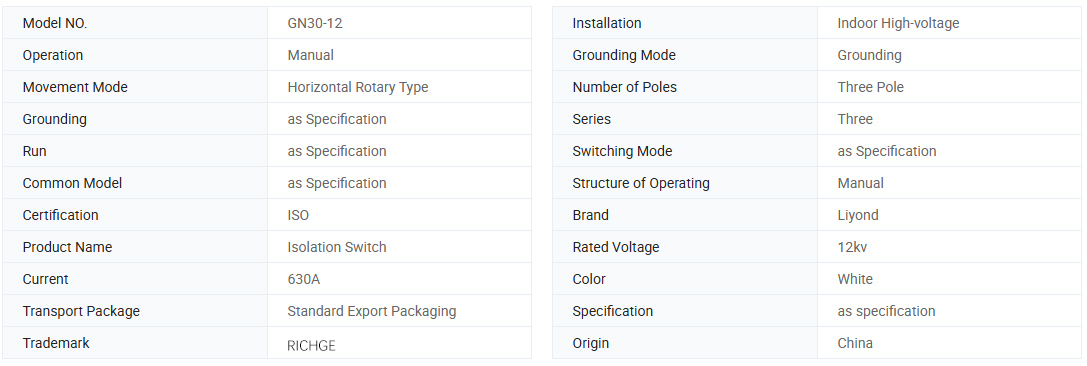 GN30-12 屋内回転式高圧断路器は、回転ナイフを備えた新しいタイプです。主な構造式は、三相共通の低フレームの上下面に2組の絶縁体と接点を固定し、ナイフの回転によりスイッチの開閉を実現します。 GN3-12D スイッチは、さまざまな電源システムのニーズを満たすために、GN30-12 に基づいて接続ナイフの形式を追加します。この製品は、コンパクトな設計、省スペース、強力な断熱性、設置と調整が簡単です。 「AC 高電圧絶縁開閉器および接地開閉器」の要件を満たしており、定格電圧 10 KV AC 50 Hz 以下の屋内システムに適用できます。電圧印加、無負荷時の開閉回路として使用できます。高電圧開閉装置と一緒に使用することも、単独で使用することもできます。