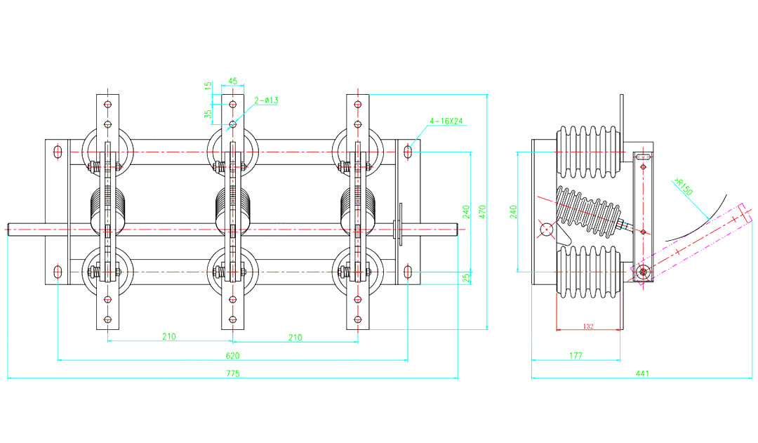 GN19-12/400、630、1000、1250タイプ断路器の導通部は各相2本の柱状絶縁体によりベースに固定されています。 (GN19-12C/400、630、1000、1250タイプは柱状絶縁体1枚、磁器ケース絶縁体1枚の構成となります。) 3相並列に設置され、導電部はコンタクトナイフとコンタクトホルダ(または導電性ロッド)の静電接点で構成されます。コンタクトナイフの各相はタイインシュレータの中間に接続され、タイインシュレータが接続されたスピンドルのベースに取り付けられます。スピンドルはハンドルを介してコネクティングロッド(ユーザー用意)およびCS6-1タイプの移動機構に接続されます。接続コンタクトナイフは2枚のスロット付き銅板で構成されており、コンタクトナイフの放熱面積が増えて底部温度が下がるだけでなく、コンタクトナイフの機械的強度も向上し、スイッチの動的安定性が向上します。コンタクトナイフの一端はボルト(ショーの車)によってコンタクトブロック(または導電性ロッド)に取り付けられます。 GN19-12/1000、1250 に接触する磁気ロック プレートの取り付けに加え、磁気ロック プレートの目的は、大きな短絡電流が発生した場合に 2 つの溝のコンタクト ナイフ間の接触を強化することです。アトラクション。 GN19-12/400、630 切断スイッチには流れる電流の制限が小さいため、磁気ロック プレートを追加する必要はありません。