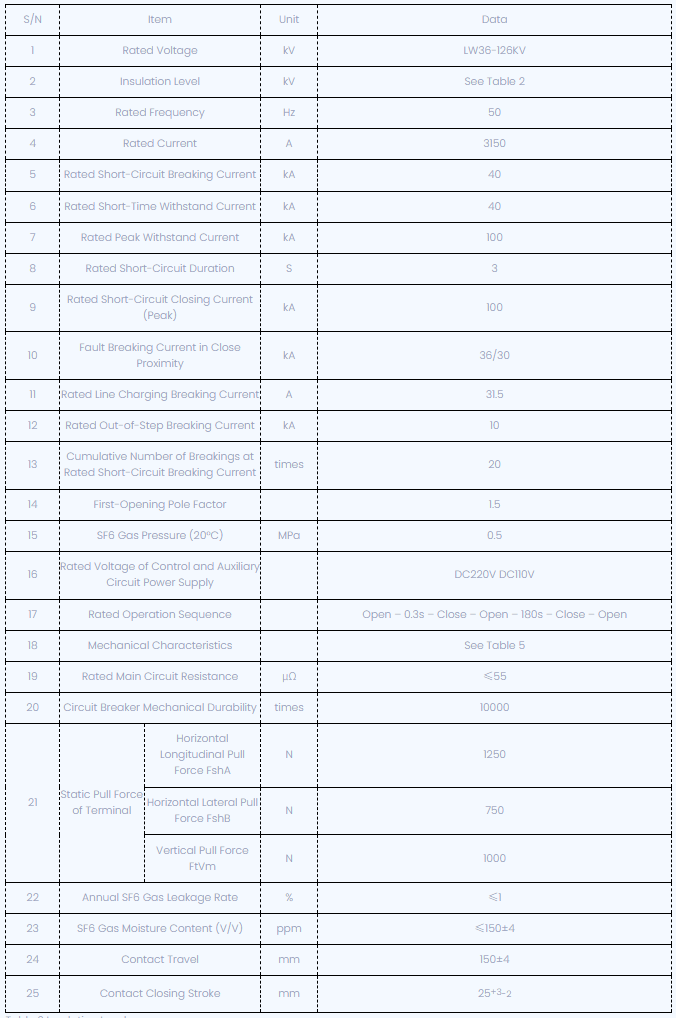 LW36-126 SF6回路ブレーカー技術パラメーター