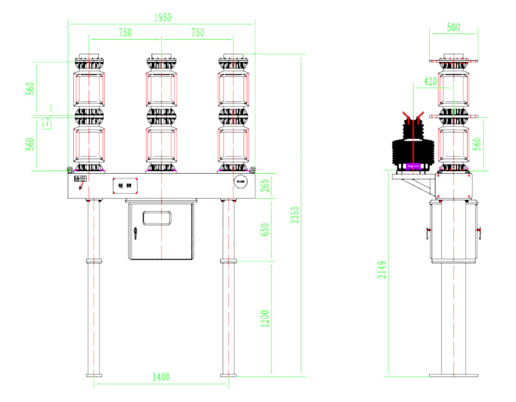ブレーカーは、3つの異なる位相を備えた磁器のコラムデザインを備えており、それぞれに圧縮空気で満たされた別のアーク吸引チャンバーが装備されています。三相ガスは銅のチューブで接続されています。ブレーカーの主要なコンポーネントには、磁器ハウジング、電流変圧器、アーク消滅チャンバー、吸収体、動作メカニズム、伝送ボックス、ベースフレーム、コネクティングロッド、スプリングが含まれます。磁器のスリーブは、ブレーカーの主回路を電源システムに接続するためのサポートと断熱材として機能します。また、圧力容器の一部を形成し、堅牢な強度を提供し、気密性を確保します。