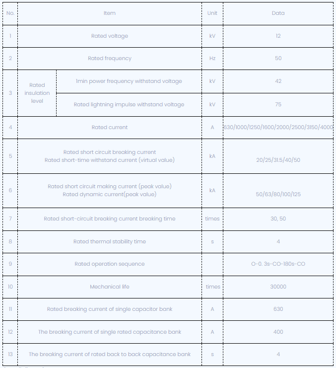VSG-12 1600A VCB固定型ソリッドポールの技術的パラメーター